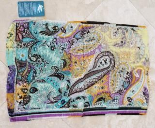 zehavi Store Offered for sale is a 100% guaranteed authentic Etro (Milano Italy) paisley patterned lightweight scarf. Condition: New with tags! Retails: $215 ($232 with tax). Features an iconic paisley theme and color palette of purple, yellow, blue, black and other colors with rolled hems. Fabric content: 76% linen and 26% silk. Measures approximately 52" by 16”. Made in Italy of course! From a smoke free, and pet free home!