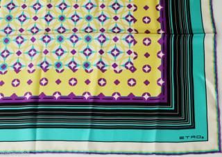 <div style="text-align:center"><img src="http://ti2.auctiva.com/sw/java.gif" border="0"><br><table align="center"><tr><td><a style="text-decoration:none" href="http://emporium.auctiva.com/zehavi" target="_blank"><img src="http://ti2.auctiva.com/sw/browse1.gif" border="0"></a></td><td height="23px" valign="middle" align="center"><font face="arial" size="2"><b><a href="http://emporium.auctiva.com/zehavi" target="_blank">zehavi</a> Store</b></font></td></tr></table></div> <img src="http://ti2.auctiva.com/web/aswCredit.gif" border="0"><br><a href="http://www.auctiva.com/?how=scLnk2" target="_blank"><img src="http://ti2.auctiva.com/images/sc1line2.gif" border="0"></a> Offered for sale is a 100% guaranteed authentic Etro (Milano Italy) geometric patterned scarf. Condition: New with tags! Retails: $360 ($390 with tax). Features a color palette of green, purple, yellow, white and black, with rolled hems. Fabric content: 100% silk. Measures approximately 35" by 35”. Measurements are approximate! Made in Italy of course! From a smoke free, and pet free home! INTERNATIONAL BUYERS: IMPORTANT!! I MUST ship via USPS Express Mail to the following countries: Russia, Russian Federation, Ukraine, Armenia, Azerbaijan, Belarus, Georgia, Kazakhstan, Kyrgyzstan, Moldova, Tajikistan, Turkmenistan, and Uzbekistan. PLEASE DO NOT PAY UNTIL I HAVE SENT YOU AN INVOICE. USPS Mail is the fastest, and safest method of shipping for both buyer and seller, and includes tracking, signature and insurance.
