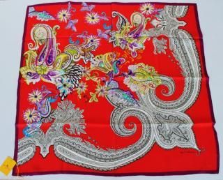 zehavi Store <img src="http://ti2.auctiva.com/web/aswCredit.gif" border="0"><br><a href="http://www.auctiva.com/?how=scLnk2" target="_blank"><img src="http://ti2.auctiva.com/images/sc1line2.gif" border="0"></a>Offered for sale is a 100% guaranteed authentic Etro (Milano Italy) paisley-floral patterned scarf. Condition: New with tags! Retails: $380 ($410 with tax). Features a color palette of red, black, white, yellow, purple, green, blue, and other colors with rolled hems and a violet border. Fabric content: 100% silk. Measures approximately 35" by 35” (90cm x 90cm). Made in Italy of course! From a smoke free, and pet free home!