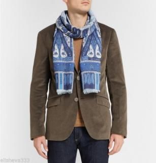 zehavi Store Offered for sale is a 100% guaranteed authentic Etro (Milano Italy) men's paisley scarf. New with tags! Retails $370 ($400 with tax). Features a color palette of multi-shades of blue and white on an iconic paisley pattern with eyelash fringe. Fabric content: 50% wool and 50% silk. Measures approximately 76" long by 26” wide. Made in Italy! From a smoke free, and pet free home!
